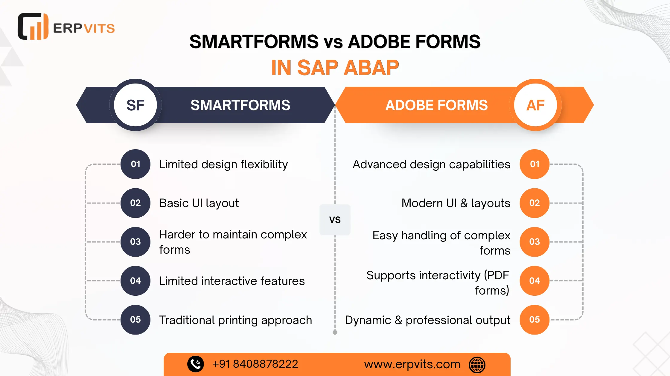 At ERPVITS, we assist enterprises develop, construct and transfer SAP output forms with a high degree of precision -- starting from old SmartForms modernization to complete Adobe Forms implementation on S/4HANA. Reach out to one of our SAP ABAP experts to start the process.